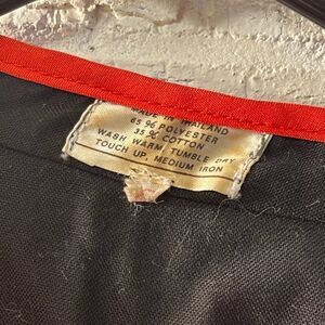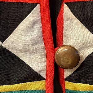 This vintage handmade tribal-style jacket and skirt set features a striking geometric patchwork pattern with vibrant red, green, yellow, and black accents. The jacket has metal button closures and intricate embroidery, while the full skirt boasts a comfortable elastic waistband and deep pockets. Set is hard to find as a two piece. Lots of listings for just the jacket, but skirt addition is a jewel!