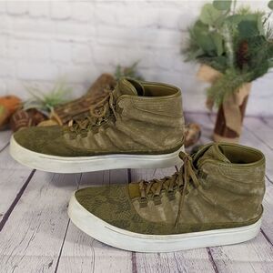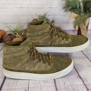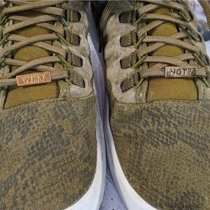 Russell Westbrook’s 0 silhouette with Jordan appears with chukka boot inspiration with fashion-forward details, like olive suede paneling, metal D-ring eyelets and a snakeskin embossed leather along the toe. Westbrook’s initials appear on the brass lace deubré, while the white vulcanized midsole adds a lifestyle appeal.