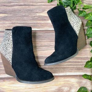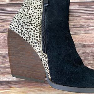 This is a suede and speckled horsehair western inspired bootie. Stacked demi wedge with a woodgrained finish. Fit true to size