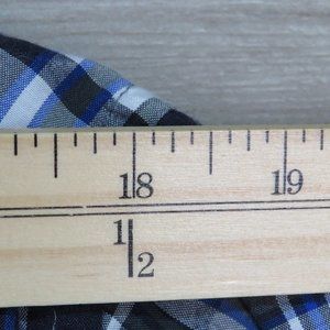 Pre-Owned, Excellent Condition! 55% Cotton/45% Polyester. Blue, Gray, White Plaid Colored Shirt with matching Buttons.
