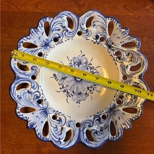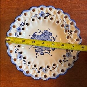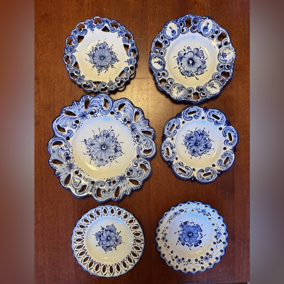 Vintage Vestal Alcobaça plates from Portugal. These are hand-painted ceramic plates with a blue and white floral design and a reticulated, or open-lace, edge. No flaws.