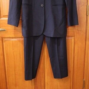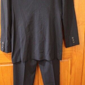 Vestimenta Spa offers classic tailored sophistication with this vintage black wool pant suit. The three-button jacket features structured lapels and a flattering fitted silhouette, while the matching dress pants provide a polished, timeless fit with a mid-rise waist and straight leg. Perfect for professional settings, interviews, or refined evening wear, this set combines enduring style with vintage craftsmanship. The versatile black wool fabric allows effortless pairing with blouses, knit tops, or statement accessories.
