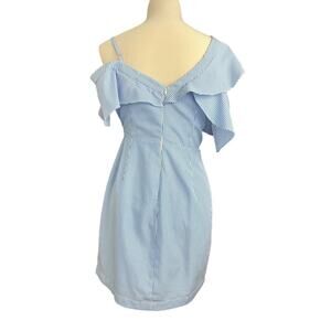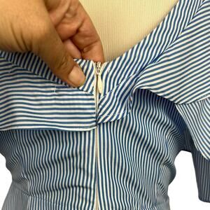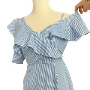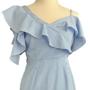 VESTIQUE Blue White Stripe Asymmetrical Shoulder Detail Ruffle Neck Hem Medium