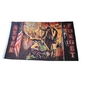 Description: "Pre-owned in good condition. Large 3' x 5' commemorative wall flag.Features powerful artwork depicting veterans, bikers, and fallen heroes at a memorial wall.