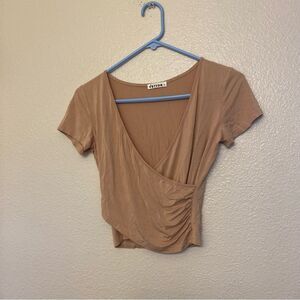 VETIOR Solid tan beige 100% modal Short Sleeve wrap front Crop Top Shirt Small