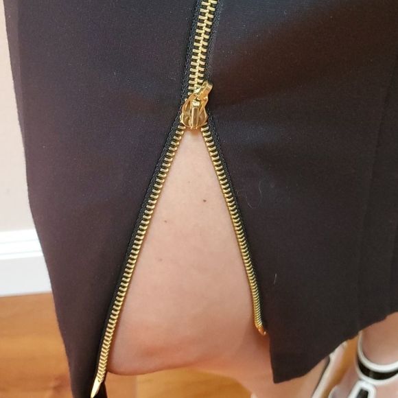 Cap sleeve knit dress w/front YG exposed zipper.Beautiful structured stitching creates peplum waist & a Perfect silhouette.Lady Boss style.Fabric very stretchy. Style runs big.TB sz 4 fits US sz 8-12.Outstanding garment construction.Fully lined.Zipper runs length of dress; adjustable top & bottom. Bottom Zip tab missing