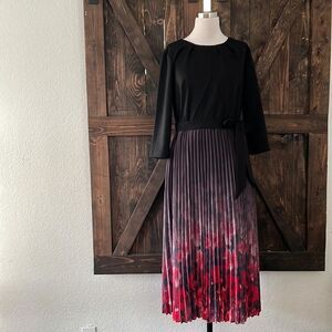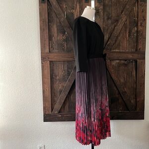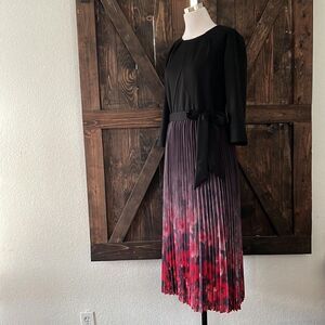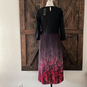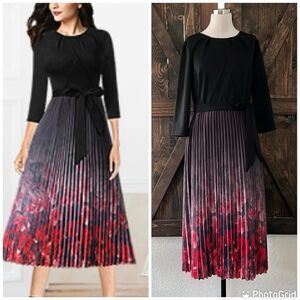 Style: Pleated round neck, short sleeves, tie waist (belt cannot be removed), pleated flared silhouette helps hide body imperfections well, color gradient design, hidden side zipper, back slit with button closure .