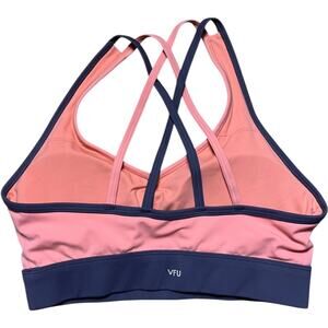 Two-tone sports bra by VFU in pink with navy trim and elastic band. Features a strappy crisscross back design with a supportive and sleek fit. Perfect for workouts, yoga, or casual athleisure wear. Good condition.