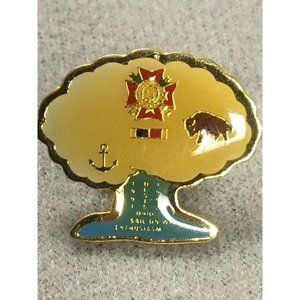 VFW Tree Pin gold toned, blue and yellow enameled pin 1991-1992. Featuring VFW Emblem, buffalo, anchor, military bar, and Ohio Dist. 5 "Sail on with Enthusiasm". 1", 1oz.