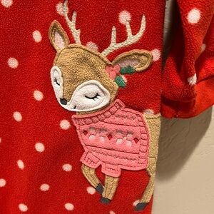 Charming red footie with white polka dots. Features a playful reindeer applique. Ideal for cozy wear.