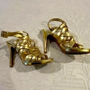 VGC Diane Von Furstenberg Muti Strap Witn Buckle at Ankle Platform Sandals in Metallic Gold Size 8. Great for Summer Dress Up or to Punch Up a Linen Outfit!