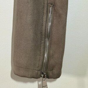 VGOSS suede biker jacket in a muted stone taupe hue. A neutral soft suede with silver zippers, motorcycle style jacket.