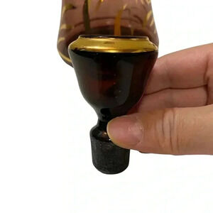 Bottle-shaped decanter with gold trim & stopper.