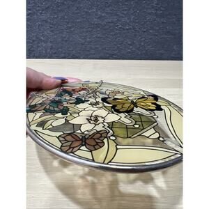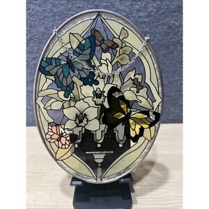 VGT Butterfly & Floral Suncatcher Stained Glass Oval Silver Trim Chained Hanger