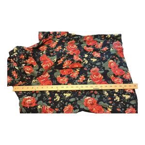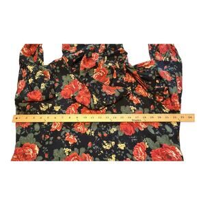 This romantic vintage Campagnie Internationale Express blouse features a bold dark floral print with lush red roses, delicate yellow blooms, and cascading ruffle details for a vintage-inspired charm. Crafted from soft 100% rayon, it drapes beautifully and feels light and airy, perfect for both casual outings and dressed-up occasions. Pair it with jeans for a boho-chic daytime look or tuck it into a skirt for a garden party or evening event.