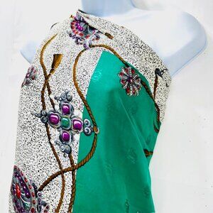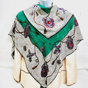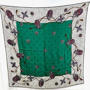 #22) Vintage Over size Full Body Wrap 41" x41" Christian Dior Soft 100% Silk Scarf Satin is a luxurious and stylish accessory for women. Made of high-quality silk satin with a vintage design featuring the iconic Dior logo, this scarf is perfect for adding a touch of art and elegance to any outfit pool beach goer. The multicolorcolor green gray black dot bow rubbie designs pattern and square style make it versatile for various occasions.