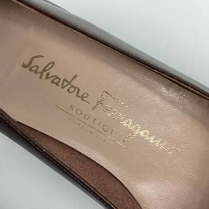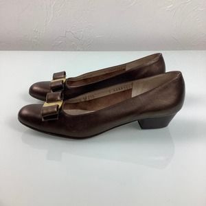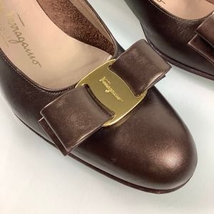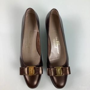 VGT Salvatore Ferragamo Varina Bronze Leather Vera Bow Heels size 7 EUC