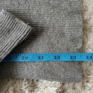 Very good used condition, no rips or holes. One tiny orange stain (see pictures), hardly noticeable and may come out in the wash, I haven't tried. Slight pilling. Light grey long sleeve wool blend sweater, ribbed waist, balloon sleeves, and a large cowl neck. 15" across the chest 23 1/2" long