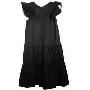 The Pomander Place by Tuckernuck Corrine flutter sleeve A-line dress is a charming mini dress in a solid black color. Designed with a round neckline and short flutter sleeves, it features a tiered accent and a back zipper closure. Made from a blend of 97% cotton and 3% spandex, this dress is hand washable and ideal for spring. Perfect for casual occasions, it embodies a cottagecore theme. The dress is in very good pre-owned condition.