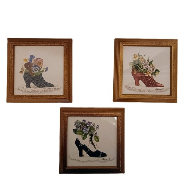 Very Good Used Condition: Elevate your home decor with this exquisite vintage set of three Consuelo Gamboa framed art prints. Each print features a charming Victorian-style high-heel shoe beautifully adorned with vibrant floral arrangements, sitting delicately on a lace-effect background. The prints are housed in elegant gold-tone frames, measuring approximately 5x5 inches. They are in excellent pre-owned condition and perfect for adding a touch of antique charm and femininity to any room, whether in a gallery wall or as standalone accent pieces. A must-have collectible for lovers of unique, artistic home accessories.