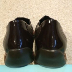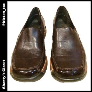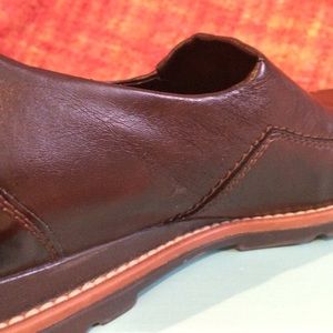 Worn twice, extremely good condition!* Handcrafted. Well-made & extremely comfortable. Dark brown leather upper with contrasting toe/heel. Thick but lightweight flexible sole of composite material for extra shock absorption, 1/2" wedge. Removable formed insole. Designed to provide more room for toes. *Very slight scuffs on edge of sole, heel, toe (so slight they don't show up in pix); insole slightly worn; small blemish on leather at left arch (see 4th photo).