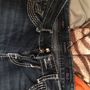 Women's VGoss brand Chelsea slim boot cut style jeans with heavy white stitching and embellishments on pockets. Great quality jeans, really heavy duty. Only been worn 4-5 times before they became too big. Can measure inseam upon request. Length 31". Dark wash. Has been washed and dried.