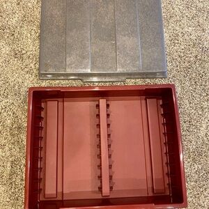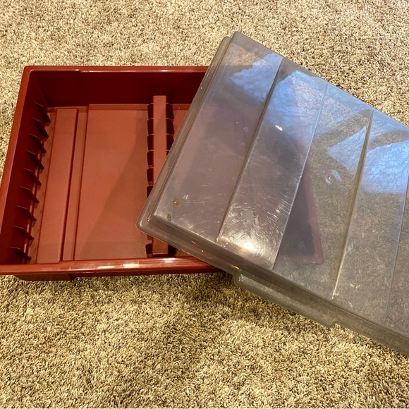 Durable red and clear storage box. Holds 20 VHS tapes. Perfect for organizing items. Has something on the lid-see photos. Heavy plastic container. No cracks or anything broken on it.