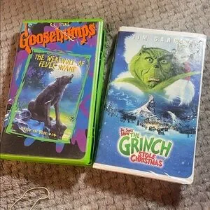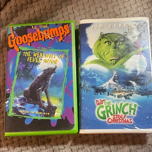 Includes Jim Carrey how the Grinch stole Christmas VHS and RL Stein goosebumps the werewolf of fever swamp