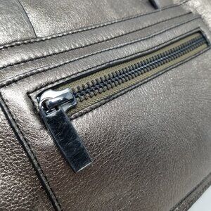 VIA SPIGA crossbody bag with bronze metallic leather, outside back zipper pocket, VIA SPIGA tag, black suede lining, dark metal hardware, inside zipper pocket and adjustable strap with snap buttons.