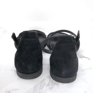 Heel measures approximately 0.5". Suede upper in a casual sandal style with an open toe. Ankle strap with adjustable buckle. In good preowned condition with with some wear. Some residue on one sole. Check photos for a closer look.