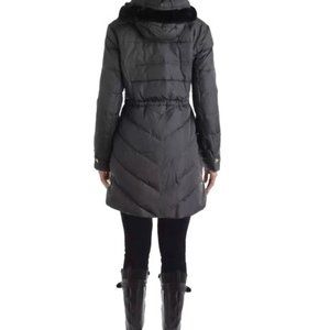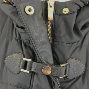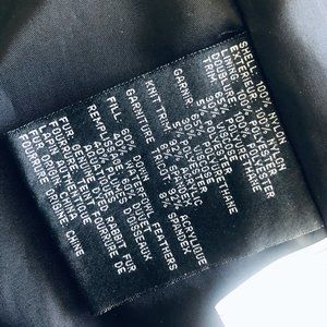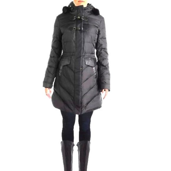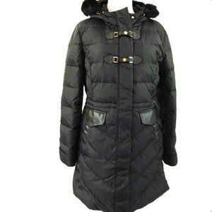 VIA SPIGA Stylish, warm, black puffer coat with 60% Down + 40% Waterfowl features snaps and zipper front closure, leather like trims, gold hardware, black rabbit fur (removable) on the hood and adjustable cord. Knit trim cuffs inside sleeves, inside pocket, adjustable waist cord from inside the coat for perfect fit. Excellent condition, worn twice only. Armpit to armpit 22 inch, Length 35 inch Size L / M