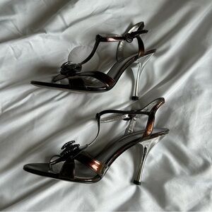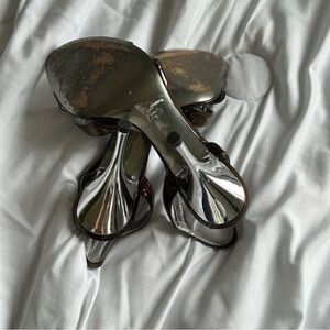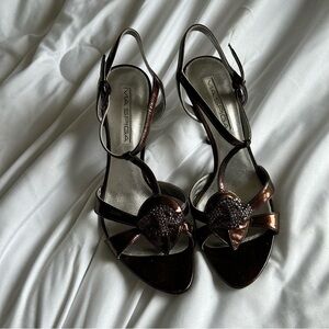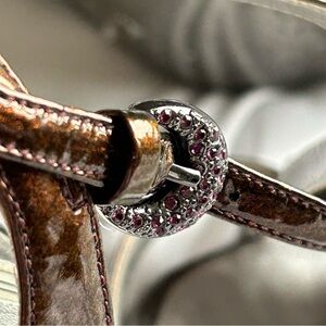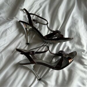 VIA SPIGA Women’s Paten Leather High Heel 6.5 T-Strap Rhinestone Brown in great condition/ strap buckle has cute rhinestones embellishment as well / silver heel / super cute