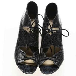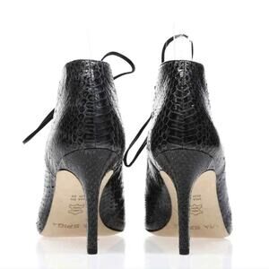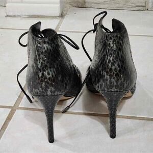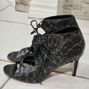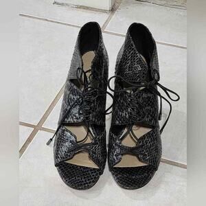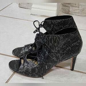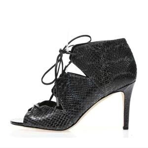 Keywords: lace up heels, peep toe booties, snakeskin print, stiletto heels, evening heels, party shoes, black heels, high heels, lace up boots, fashion heels, designer inspired, special occasion shoes