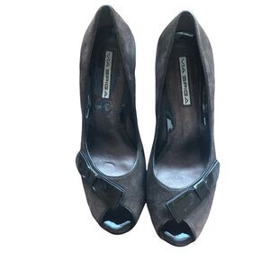 Brown Suede Herls, peep toe, patent leather bow side, NWT Size 6