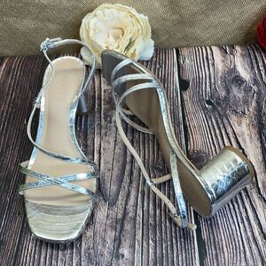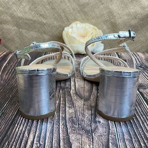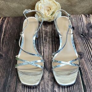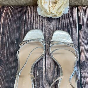 Slender straps add lithe style to a shimmering sandal lifted by a column heel.