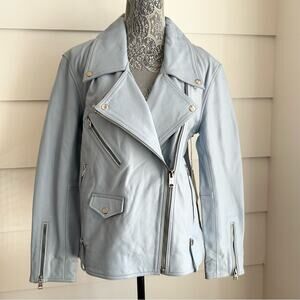 VIAVIA Genuine Leather Oversized Moto Jacket In Clear Sky Blue Size M