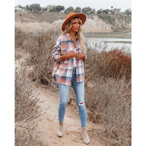 SO cute and in excellent like new condition from VICI! This mauve, dusty navy, pale yellow, and ivory plaid shacket comes in a soft fabric with front button closures and button cuffs. Relaxed Fit. 80% Polyester and 20% Wool. Collared. Long Sleeves with Button Cuffs. Bust Pockets. Soft Fabrication. Front Button Closure. Size L.