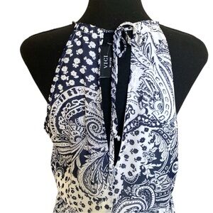 VICI Elegant navy/white paisley maxi slip dress. Women’s size medium PTP 19” Elastic Waist 28” up to 34” Length 53” The color is deceiving it has a slight touch of black depending on the sunlight. Keyhole back with a Halter-tie. Cinched waist with drawstring. Front Split, with a short white no see thru lining. See video Perfect for adding a touch of sophistication to any outfit. #slipdress#paisleyprint#summermaxidress