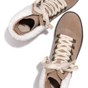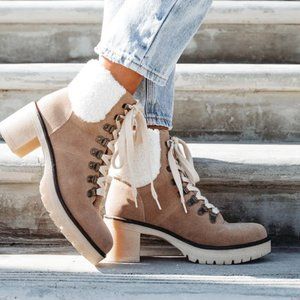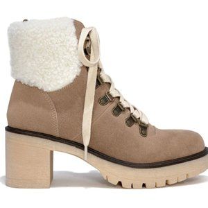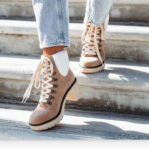Go for an outdoorsy vibe in the Conquest Heeled Shearling Lace Up Boot in khaki that features a lace up front.