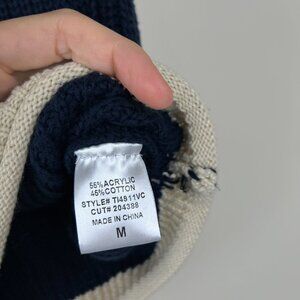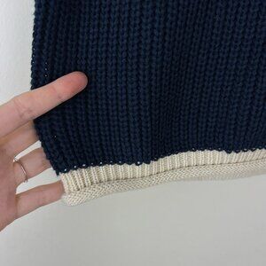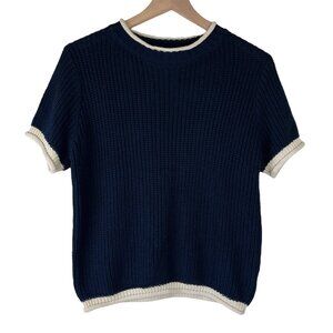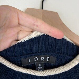 VICI FORE Navy Clocking In Short Sleeve Crew Neck Sweater. Navy blue with cream contrast trim. Pullover. Knit. Brand is fore from VICI. Preppy, coastal. Acrylic cotton blend. Retail: $48. Size Medium. Armpit to armpit: 18.5". Length: 22". (585)