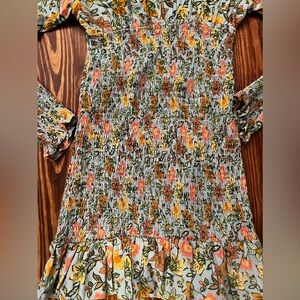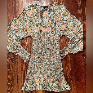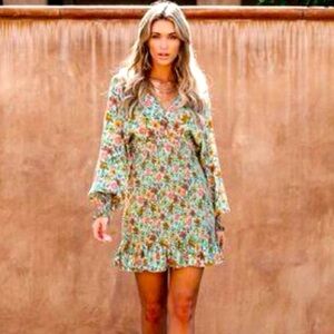 Stunning VICI Floral dress with long sleeves (balloon style) and gorgeous floral print! Love the smocked bodice, so comfy and stretchy! Top features V neckline with ties!