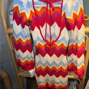 Embrace vibrant style with this colorful chevron knit dress. Perfect for any occasion, this dress features a bold pattern in red, orange, and blue hues. Stand out with its unique design and comfortable fit.