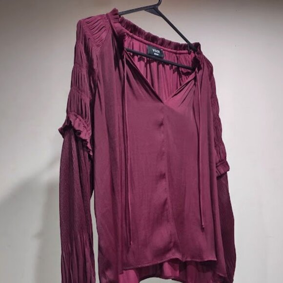 VICI, MAROON BLOUSE, LONG SLEEVES, HIGHLY RUCHED AND RUFFLED ARMS AND CUFFS, TIES ON NECKLINE, VNECK, RUFFLED COLLAR, HIGH LOW HEM, OVERSIZED AND BLOUSY, LIGHTWEIGHT, WOMEN'S SIZE SMALL