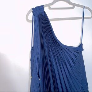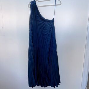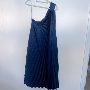 VICI Melina Satin One Shoulder Pleated Navy Midi Dress