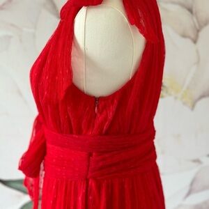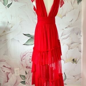 This VICI Red Carrie In Paris Tiered Polka Dot Tulle Midi Dress is available in a size small. It's in excellent condition. I only wore this dress once for an event. The color is beautiful and perfect for Valentines!