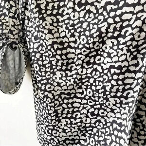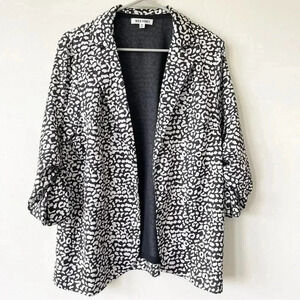 Resilient Leopard Blazer has your back! Designed with a notched lapel, long sleeves with roll tabs and a relaxed fit. Printed with ivory leopard spots on a black satiny base. The soft and blousy feel of this blazer is amazing! More of a top as opposed to a structured blazer.