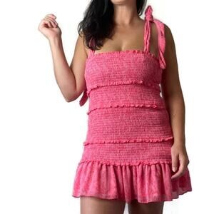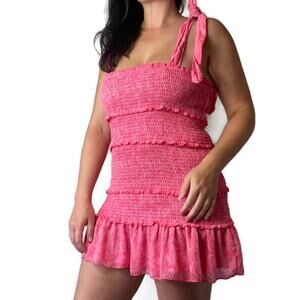 Excellent used condition! Two-tone pink floral mini dress. Ruffled and smocked with adjustable tie straps. Fun and flirty. Great for date night, as a wedding guest, or other special occasion.