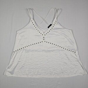 VICI women's white camisole tank top, size Large, with silver-tone studs along neckline and angled seams. Soft rayon blend with crisscross back straps for a chic touch. Bust 20”, Length 26”. Ideal for summer, festival, boho, or casual outfits. Pre-owned, excellent condition.