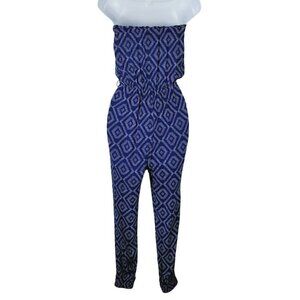 VICI Strapless Jumpsuit Navy Blue Diamond Pattern Sz Small Cuffed Leg Hem READ