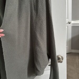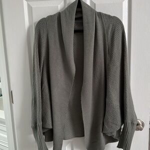Embrace the cozy elegance of the Wishlist gray cardigan, designed with an open front and a flowing shawl collar. This lightweight knit piece offers a relaxed fit, perfect for layering over your favorite outfits. Its versatile style makes it an essential addition to any casual wardrobe. Size is Medium/Large